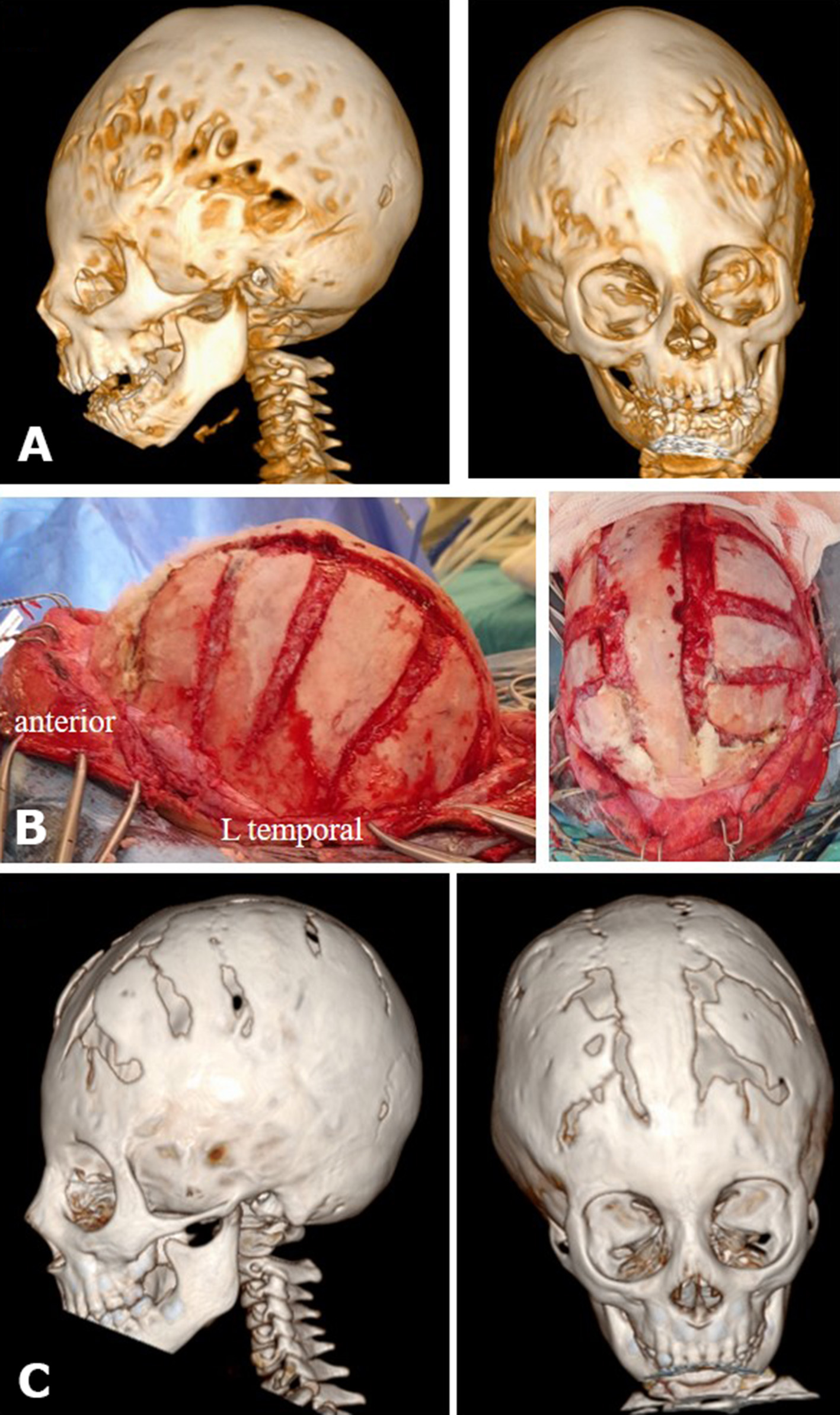 The child underwent surgery. After a bicoronal skin incision, bilateral paramedian parietal bony incision using a high speed craniotome along the fused S suture was made. The middline S bone left in place. The craniotomy was extended beyond the closed cranial suture along the M suture. Then bilateral barrel-stave osteotomies were performed bilaterally and extended to the contiguous frontal bone with bilateral removal of fused C sutures (Fig. 1B). The postoperative course was uneventful. Postoperative assessments noted improvement in forehead flattening, with further enhancement observed fifteen months post-surgery. Radiologic evaluation showed resolution of the increased intracranial pressure on the cranial bone with widened biparietal diameter (Fig. 1C).