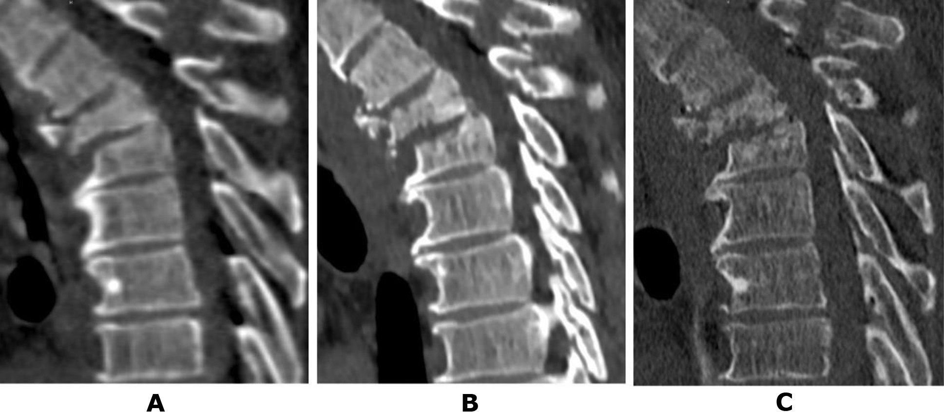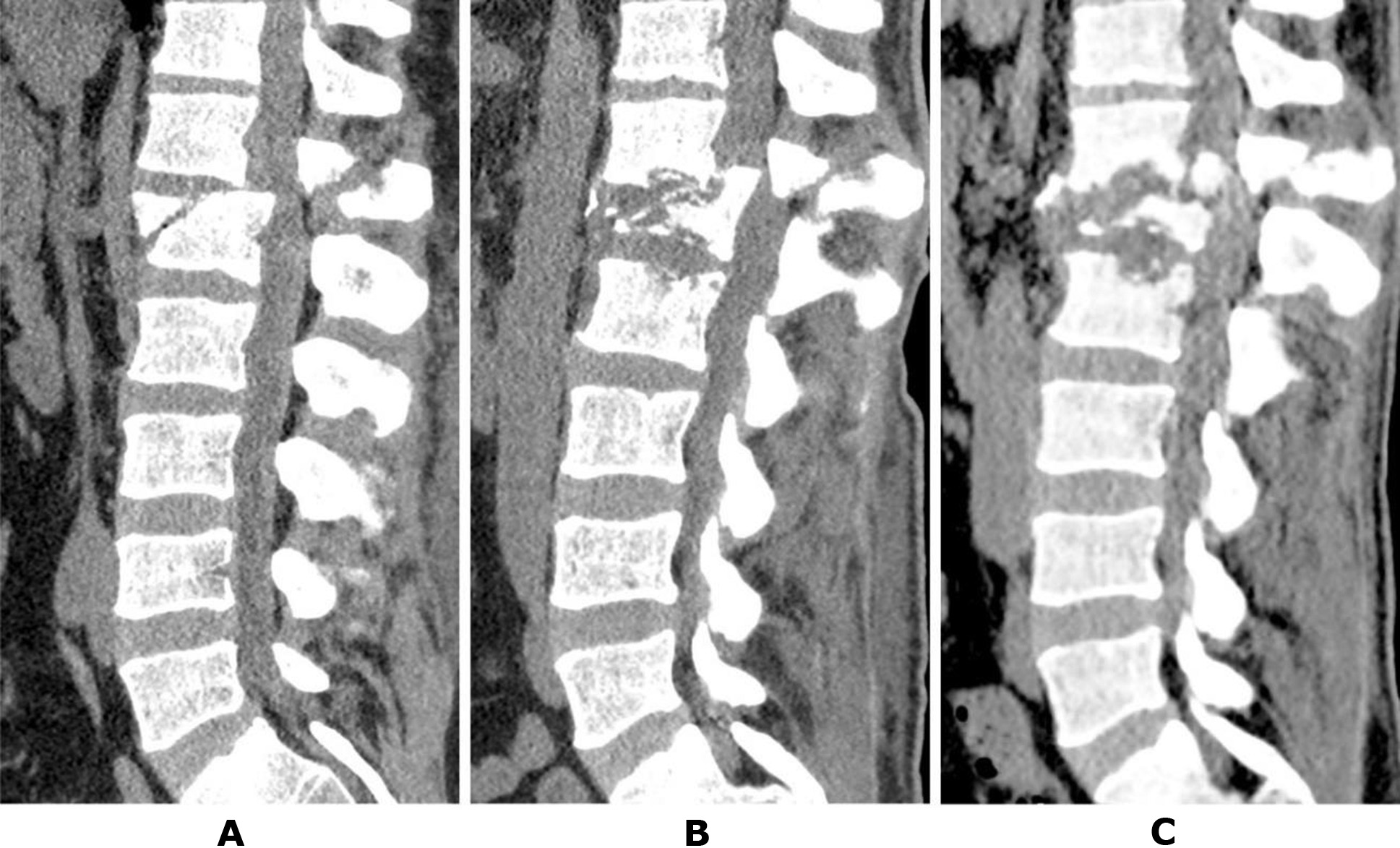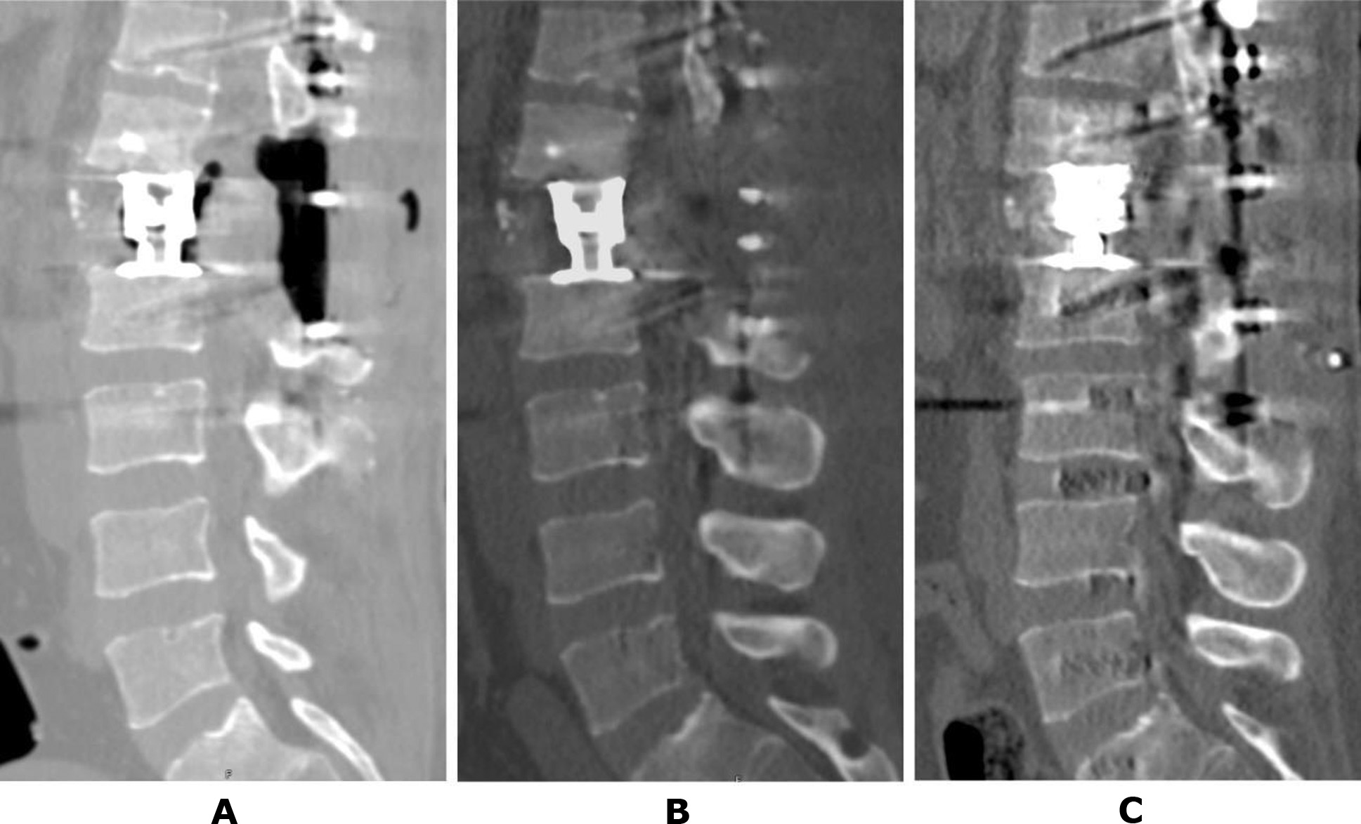 It is noteworthy that stabilization surgery in all patients with post-traumatic necrosis associated with unstable spinal injuries completely prevented further progression of destructive processes. None of the presented clinical cases involved the use of osteotropic antibacterial therapy, underscoring the aseptic nature of the condition. For example, consider the follow-up data of patient T. (Case No. 2). Amid total lysis of the L1 vertebral body, rapid destruction of the endplates of the adjacent vertebrae was observed (see Figures 2B, 2C). However, following decompressive-stabilization surgery—including removal of L1 vertebral body fragments, placement of a body-replacement implant via a posterior approach, and subsequent transpedicular stabilization of the Th11-Th12-L2-L3 vertebrae—the process was fully arrested (Fig. 4A). Follow-up studies conducted 2 and 6 months after surgery demonstrated stable fixation and no signs of progressive osteolysis (Figures 4B, 4C).