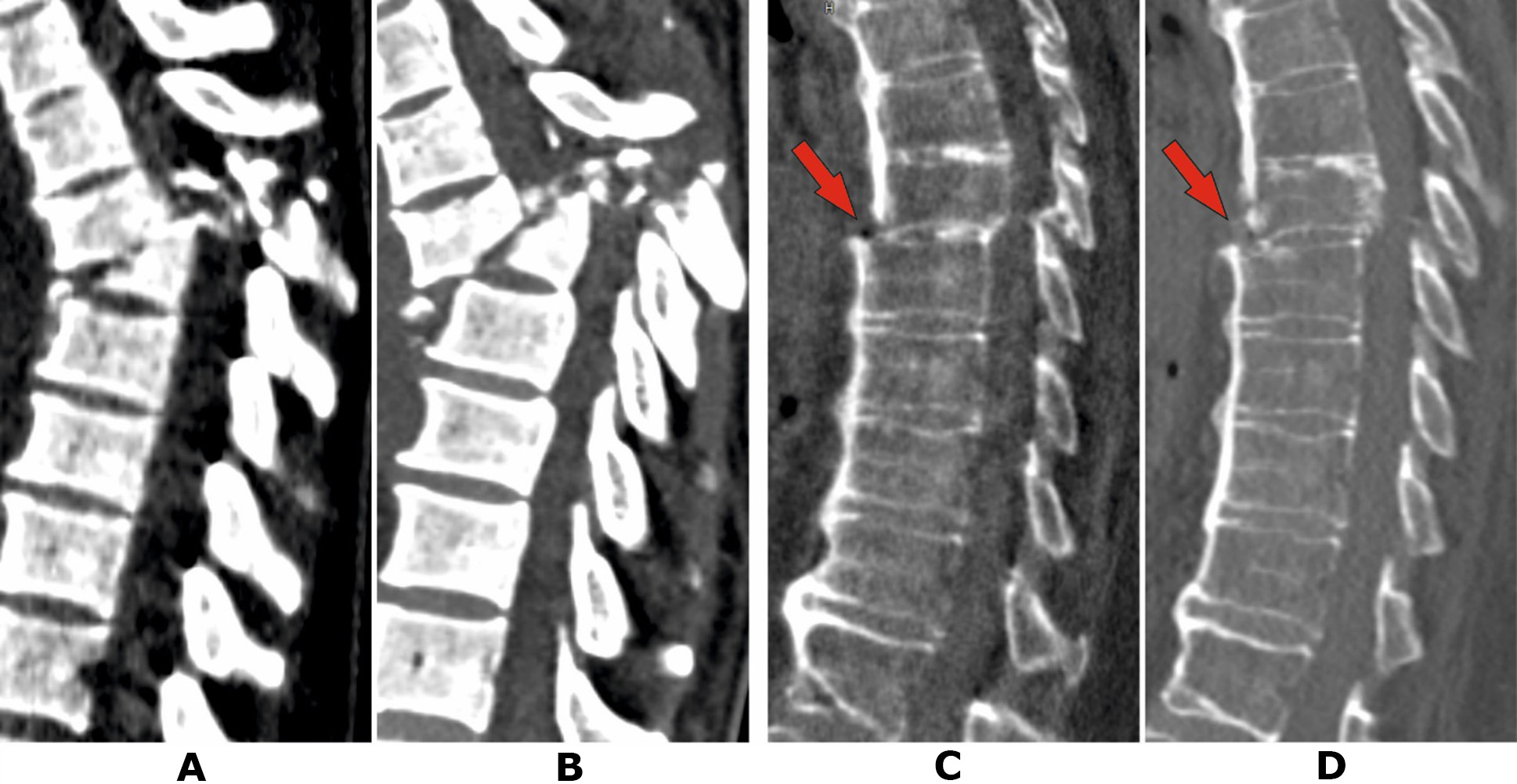 Fig. 3. Patient P., 37 years old. CT scans of the thoracic spine: A – on the day of the injury; B – after 5 weeks. Patient V., 58 years old: C – 2 days post-injury; D – after 2 months (details in the text)