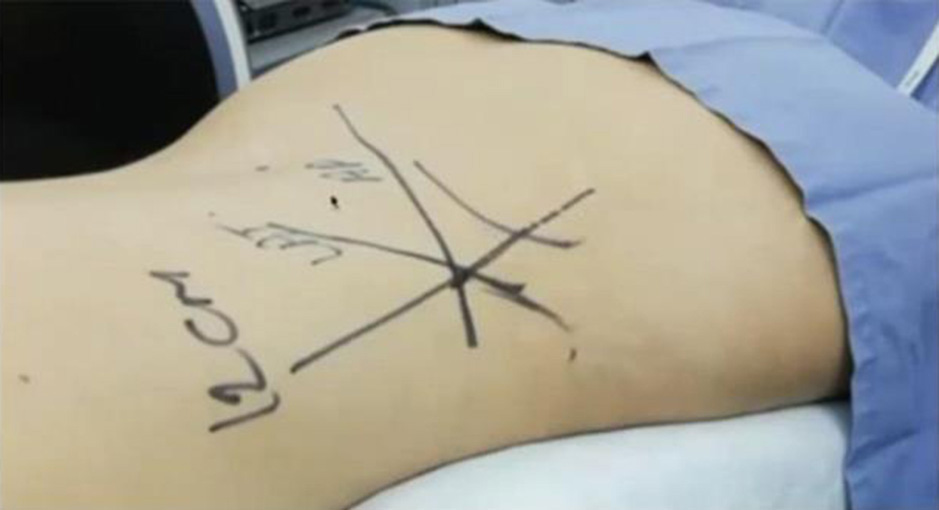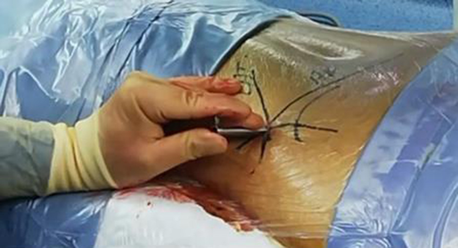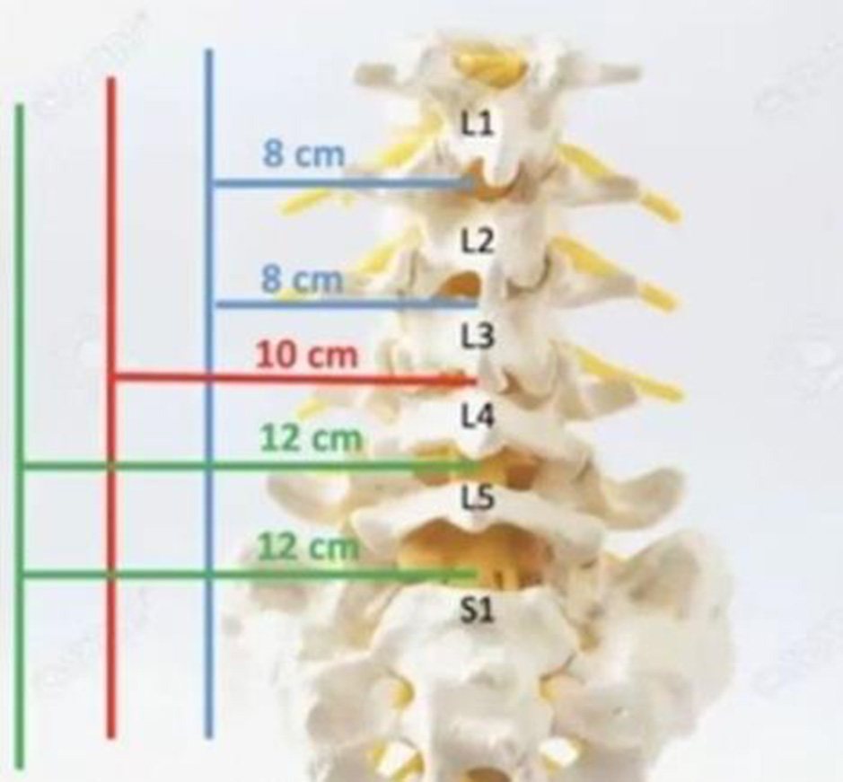 The procedure was performed under intravenous anesthesia with local potentiation. Muscle relaxant solutions were not used, which is essential for this type of surgery. The patient was placed in a prone position. The level of surgical intervention was verified using intraoperative radiography. The surgical approach is crucial to the success of the procedure; depending on the level of intervention, the distance from the midline increases in the caudal direction (Fig. 1). The operation can be conventionally divided into three stages: