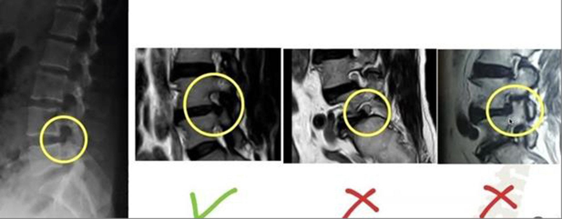 Pre-defined limitations of the method included central disc herniations, foraminal stenosis, nerve root exit through the inferior aspect of the foramen, cranial migration of L5-S1 herniation, and life-threatening contraindications.