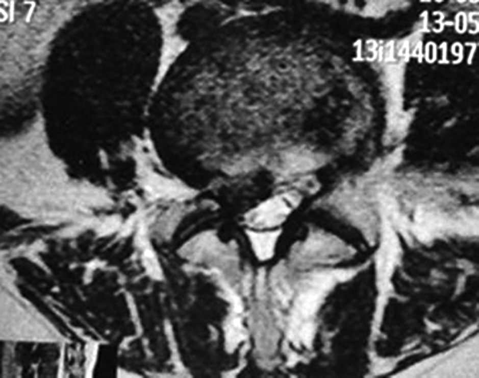 Fig. 6. MRT scan. Posterolateral herniation of the L4-L5 intervertebral disc with a right foraminal component