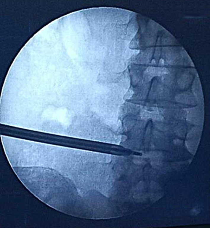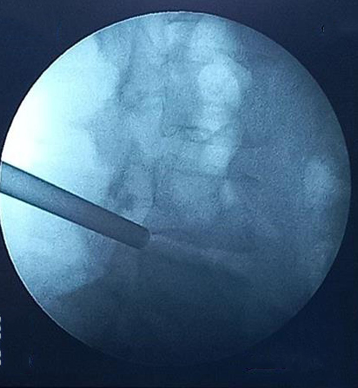 A transforaminal endoscopic microdiscectomy of the L4-L5 intervertebral disc on the right was performed. Fig. 7 shows fluoroscopic guidance of the endoscope port placement in the specified area of the L4-L5 intervertebral space on the right.