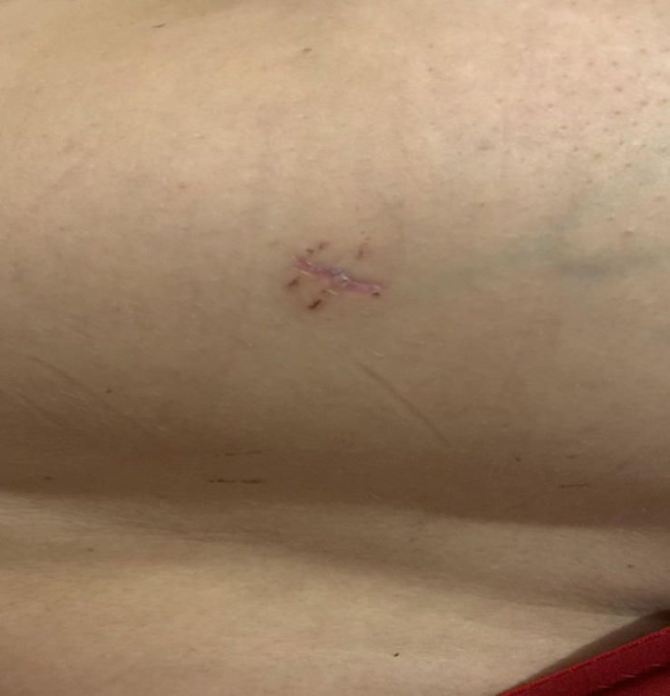 Immediately after the surgery, the patient reported complete regression of the pain syndrome. She was mobilized 3 hours postoperatively. Since she resides in another city, she remained in the hospital overnight. She was discharged the following morning in satisfactory condition. Two weeks later, she reported feeling well, with no complaints and a postoperative scar showing no signs of inflammation (Fig. 8). One and a half weeks after surgery, the patient resumed her regular professional activities.