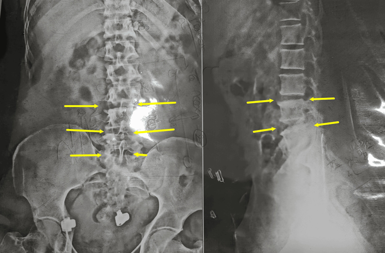 He initially sought treatment at a government hospital orthopaedic clinic, where he received nonsteroidal anti-inflammatory drugs (NSAIDs) and physiotherapy for 15 days. Four months later, upon recurrence of symptoms, spinal decompression surgery was recommended. However, due to financial constraints and inability to take leave from work for postoperative recovery, the patient opted to manage pain exacerbations with NSAIDs (Table 1).