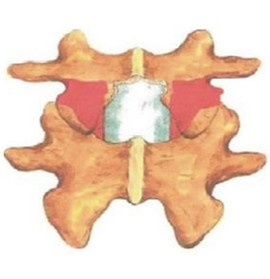 Fig. 1. Diagrammatic representation of the lower half laminectomy of lumbar vertebra: the shaded portion in red is the part to be removed to gain access to the prolapsed disc part, white shiny part in mid represents the dural covering of spinal cord