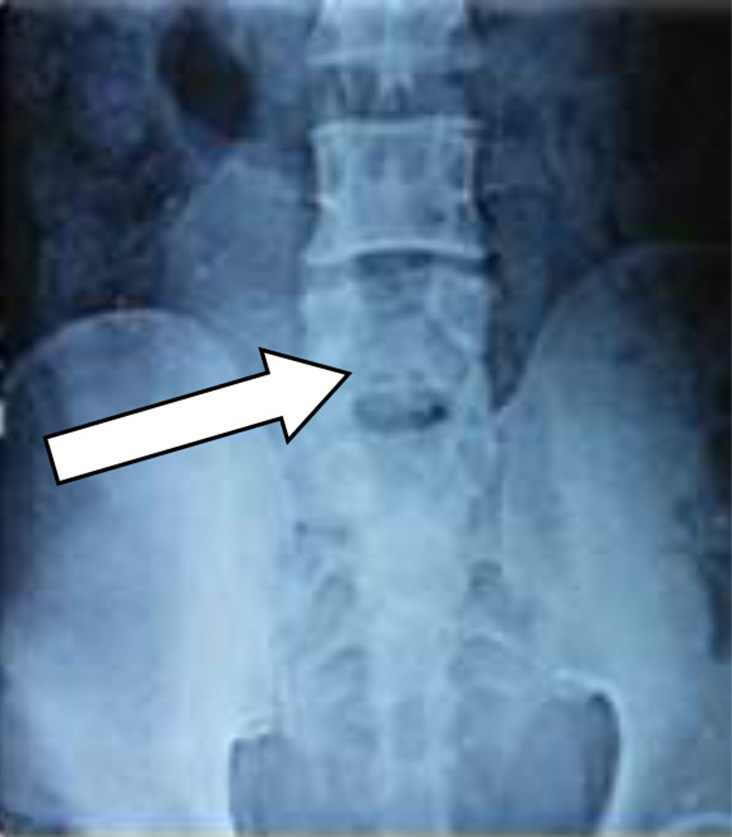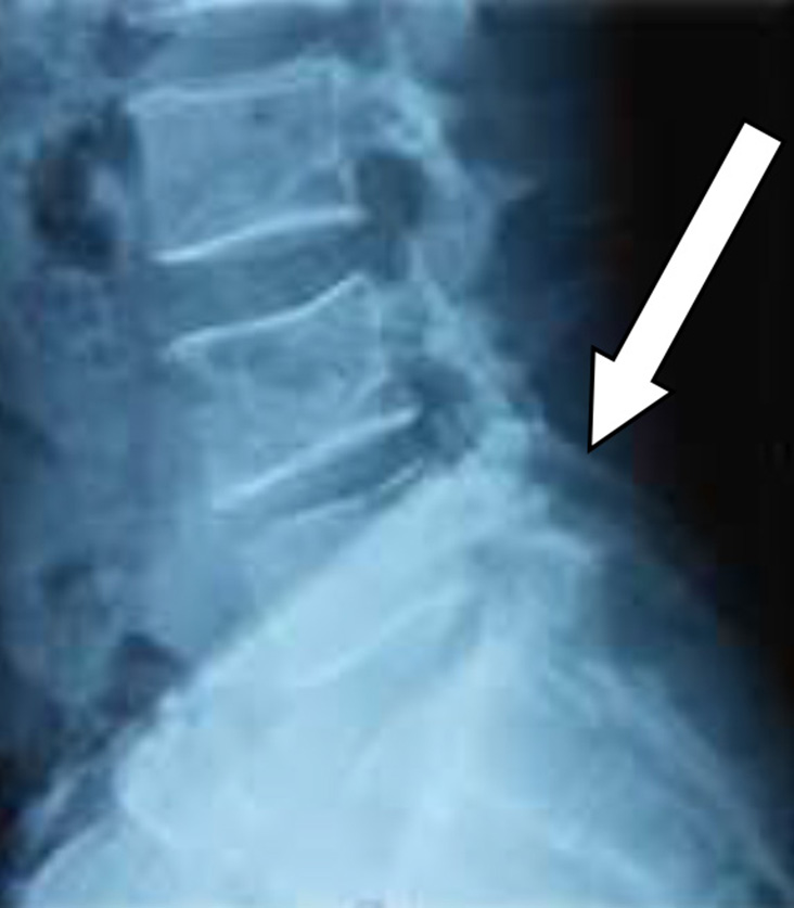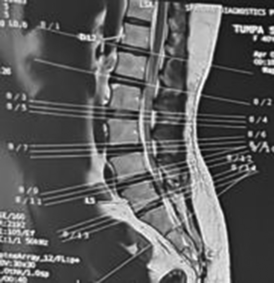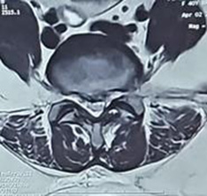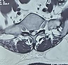 Following spinal anesthesia, patients were positioned prone. A midline incision was made one level above and below the involved segment. C-arm intensifier was utilized, especially when sacralization or lumbarization was identified in preoperative imaging. The spine and laminae were exposed, centering on the affected disc space. Portions of the spinous process and interspinous ligament were excised. The lower halves of both laminae were removed until the epidural fat became visible through the ligamentum flavum in the midline. (Fig. 1). The ligamentum flavum was excised bilaterally, and in certain cases, the overhanging portions of the hypertrophied medial facets were removed using a Kerrison punch. A standard technique was employed for discectomy, ensuring the complete removal of all visible disc material. Both nerve roots were examined for any additional compressive elements before they entered their respective foramina. For L5-S1 disc prolapse, only ligamentum flavectomy was performed with limited laminectomy (even less than the lower half) to facilitate adequate discectomy. The wounds were closed in layers after achieving proper hemostasis. For illustration images from a case of L5-S1 disc prolapsed are presented(pre-operative MRI and post operative X-ray) (Fig. 2-4).