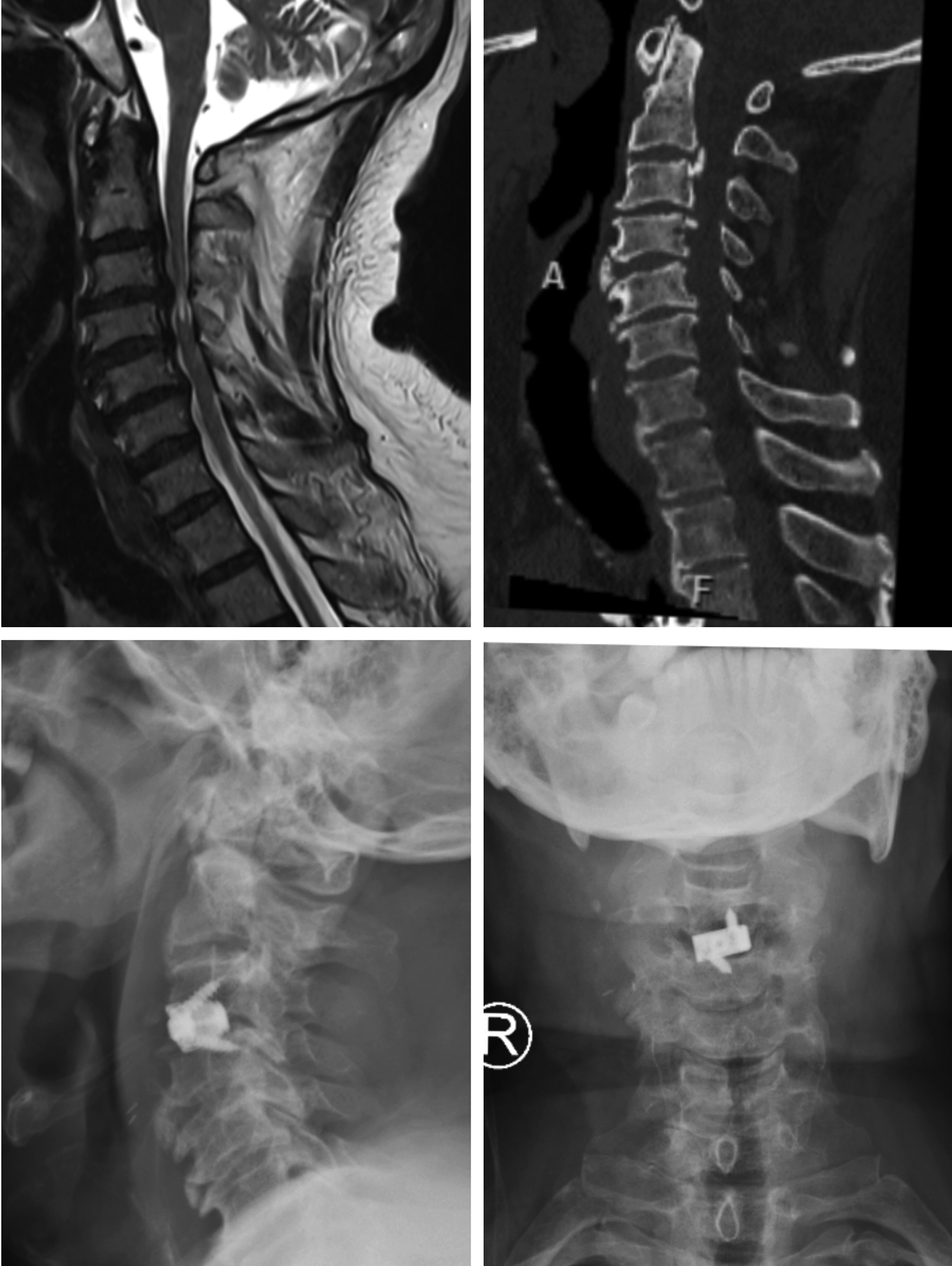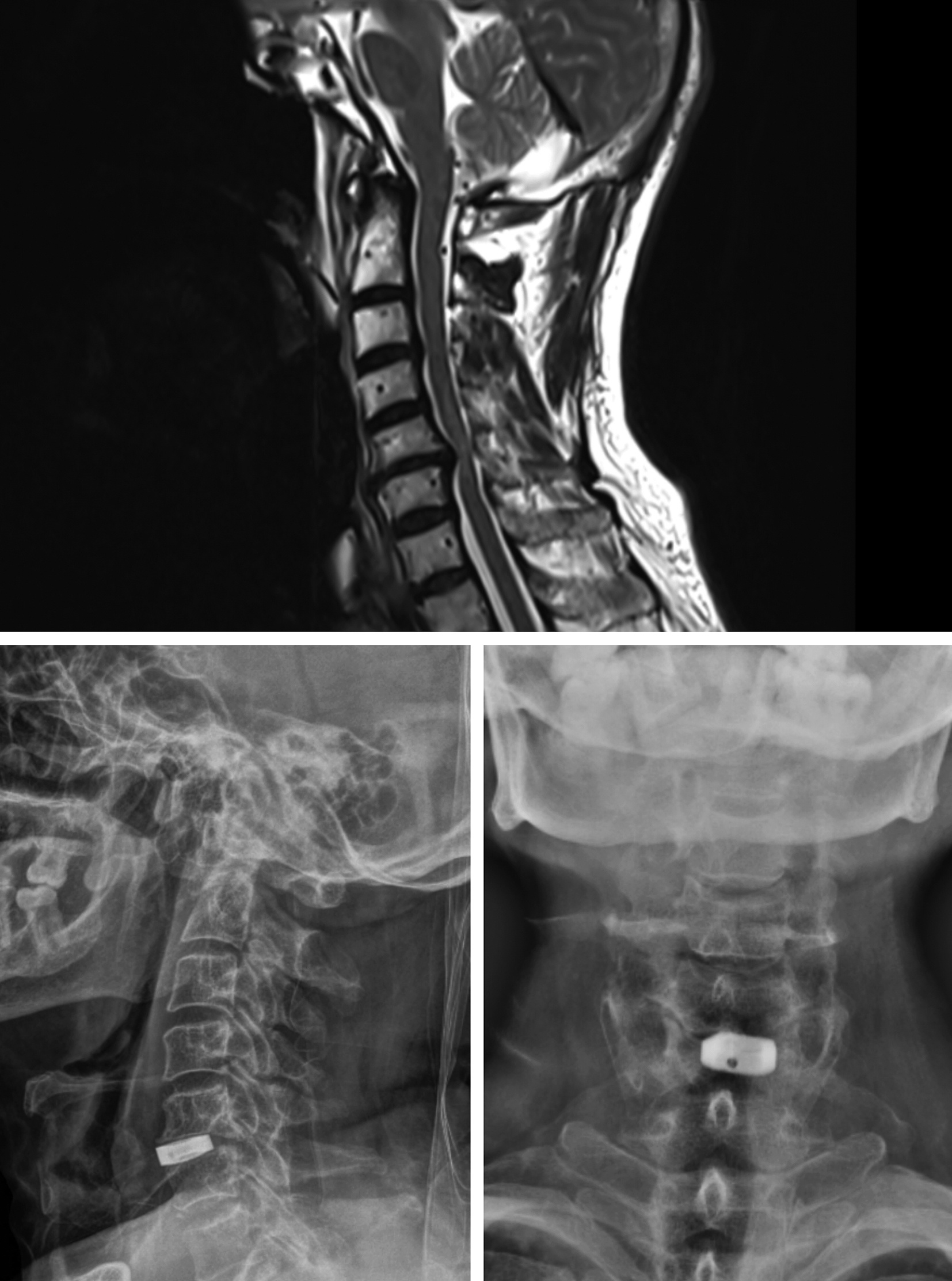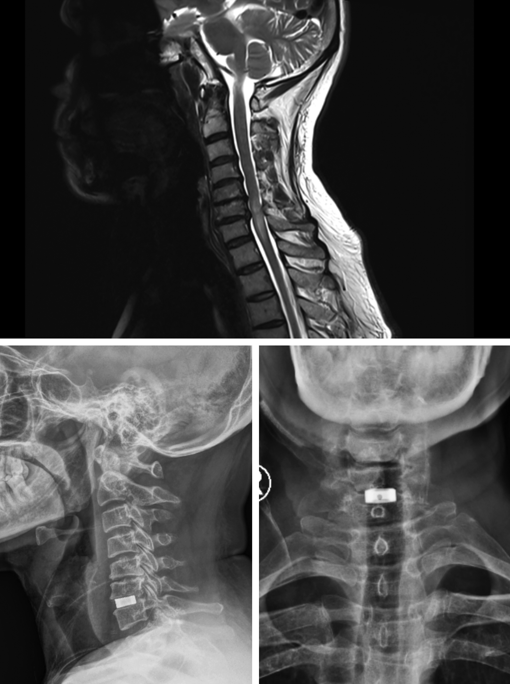 Figure 2. A - Preoperative magnetic resonance imaging study of the cervical spine (T2 weighted image, sagittal view) showing cervical compressive myelopathy with disc osteophyte complex; B - Postoperative radiographic imaging study of the cervical spine (sagittal view) showing the cage in situ; C - Postoperative radiographic imaging study of the cervical spine (coronal view) showing the cage in situ