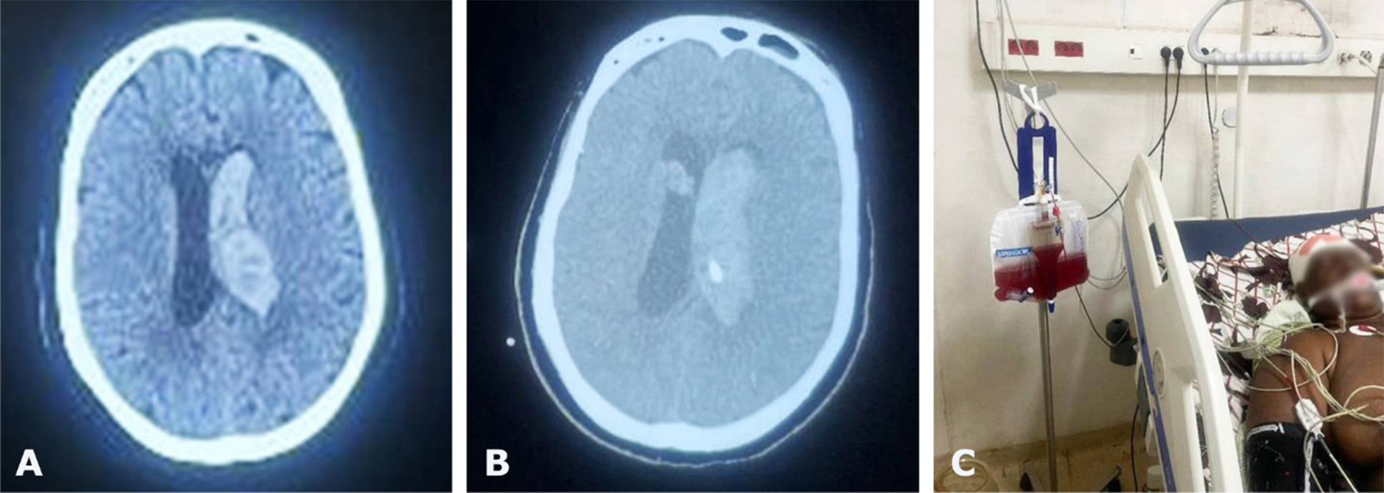 Fig. 1. Preoperative CT scan showing IVH (A), postoperative CT scan showing intraventricular location of the catheter tip (B) and photograph of Patient with EVD in-situ ICU (C)