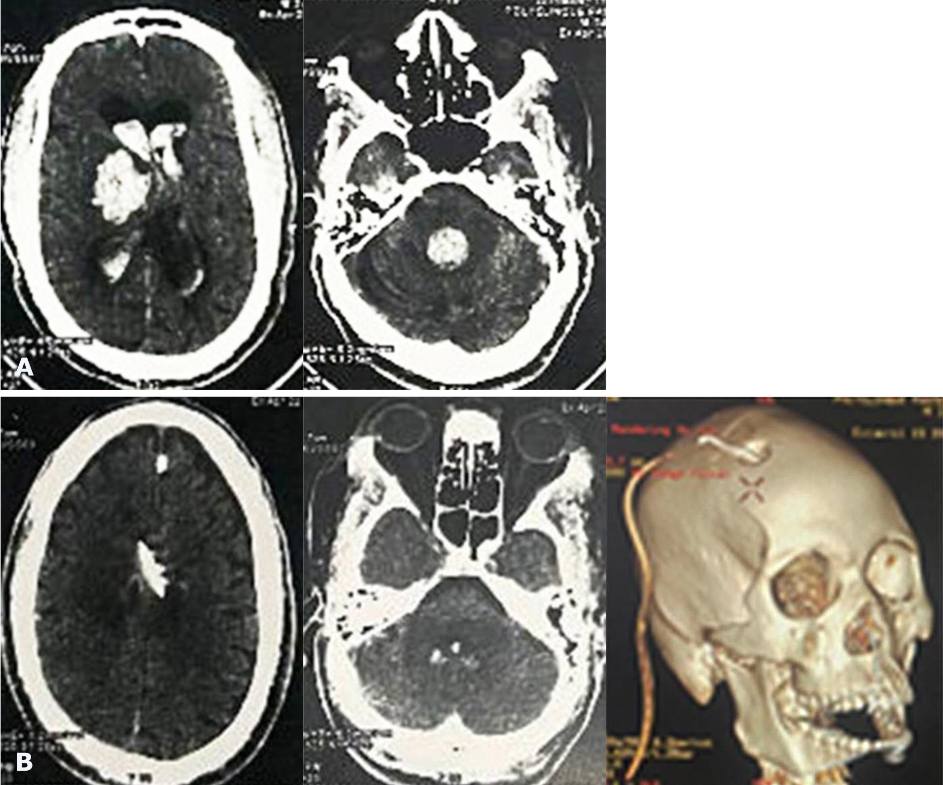 Fig. 2. Preoperative CT scan showing ICH with IVH (A), and postoperative CT scan showing intraventricular catheter tip in the ventricle as well as the decrease of ventricle size and hematoma (B)