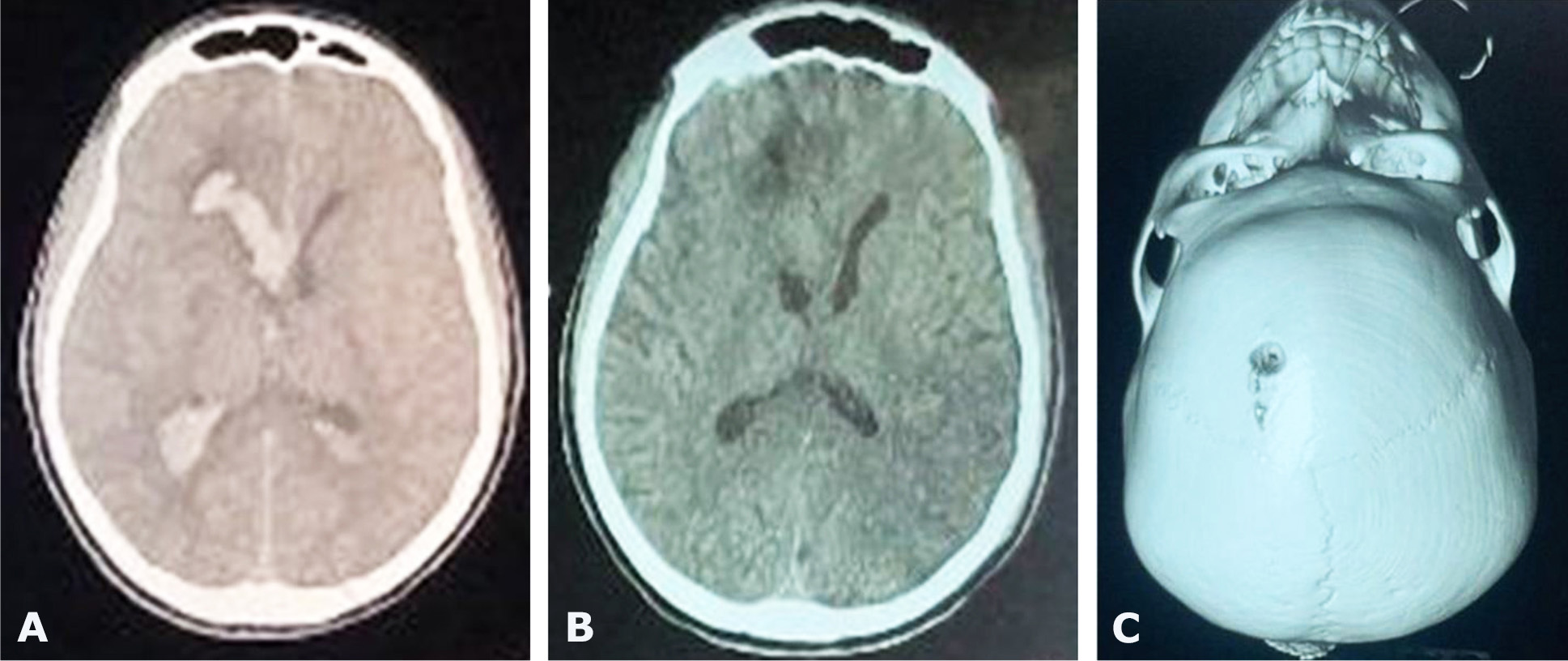 Fig. 3. Preoperative CT scan showing IVH (A) and postoperative CT scan showing the complete evacuation of IVH after EVD (B) with the burr hole in 3D (C)