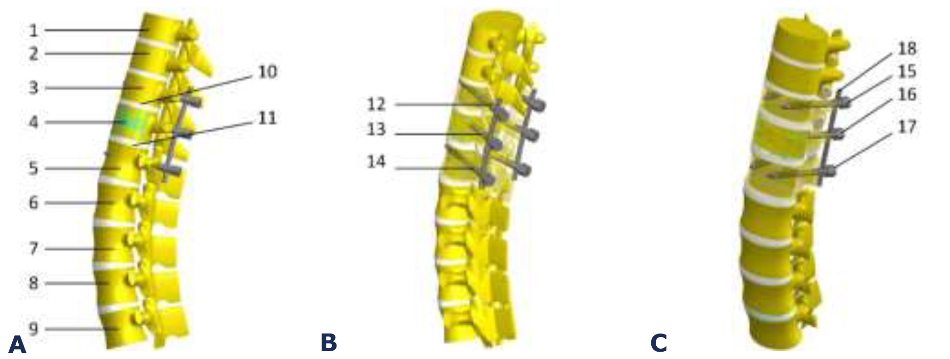 screws within the vertebral bodies Th11 (point 15), Th12 (point 16), and L1 (point 17) (for models without intermediate fixation, points 13 and 16 are absent, as no screws were inserted into Th12);