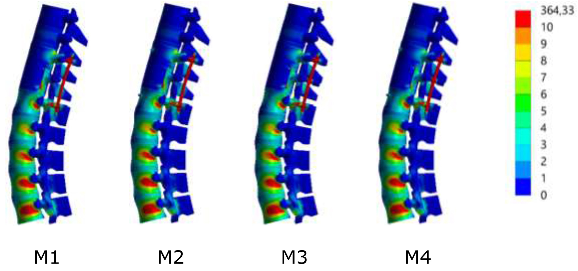 With intermediate screws into the Th12 vertebral body, the changes were modest. Adding an intermediate support in the short-screw model (M3) did not significantly alter rod stress, yielding a maximum of 324.8 MPa, practically identical to the baseline model M1 (difference <0.1%). The configuration with long screws and an intermediate support (M4) reduced the maximum stress to 321.0 MPa, or 1.2% lower than the baseline (M1). The difference between models M3 and M4 was minimal (≈1.2%), indicating that in this configuration, the main contribution to rod unloading is provided by the screw length rather than the presence of an intermediate support.