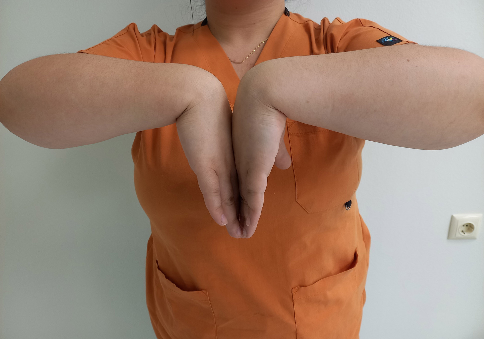 The modified test is performed as follows. The subject is asked to join the back surfaces of both hands, relax the upper limbs, and, in this relaxed state, lower the elbow joints below the horizontal line [7]. This technique of lowering the elbow joints actively increases the angle of flexion in the wrist joints. The fingers should be extended during the test (Fig. 2). If the characteristic signs of CTS are reproduced within one minute, the test is considered positive. If these symptoms are not present, the result is considered negative.