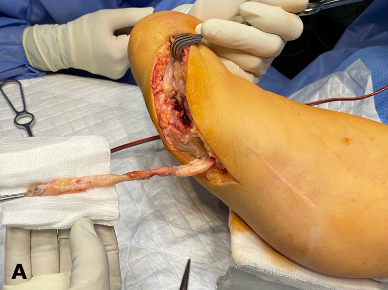 In patients with pain syndrome resulting from the formation of painful neuromas, the following surgical procedures were performed: neuroma resection with transposition of the nerve into deeper tissues (21.4% of cases); regenerative peripheral nerve interface (RPNI) creation (60.7%)—wrapping groups of fascicles of a mixed nerve with small fragments of denervated free skeletal muscle (Fig. 4); and targeted muscle reinnervation (TMR) (17.9%)—coaptation of the mixed nerve forming the painful neuroma to a motor nerve innervating the skeletal muscle of the residual limb (Fig. 5).