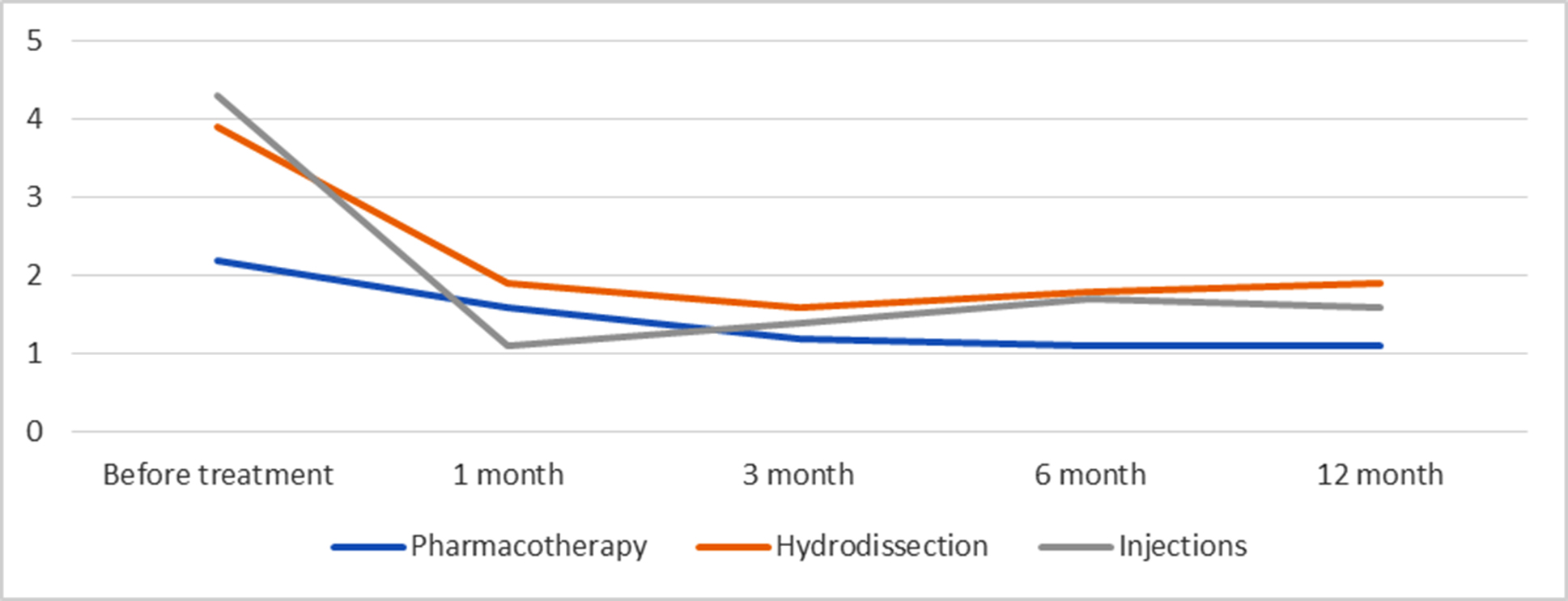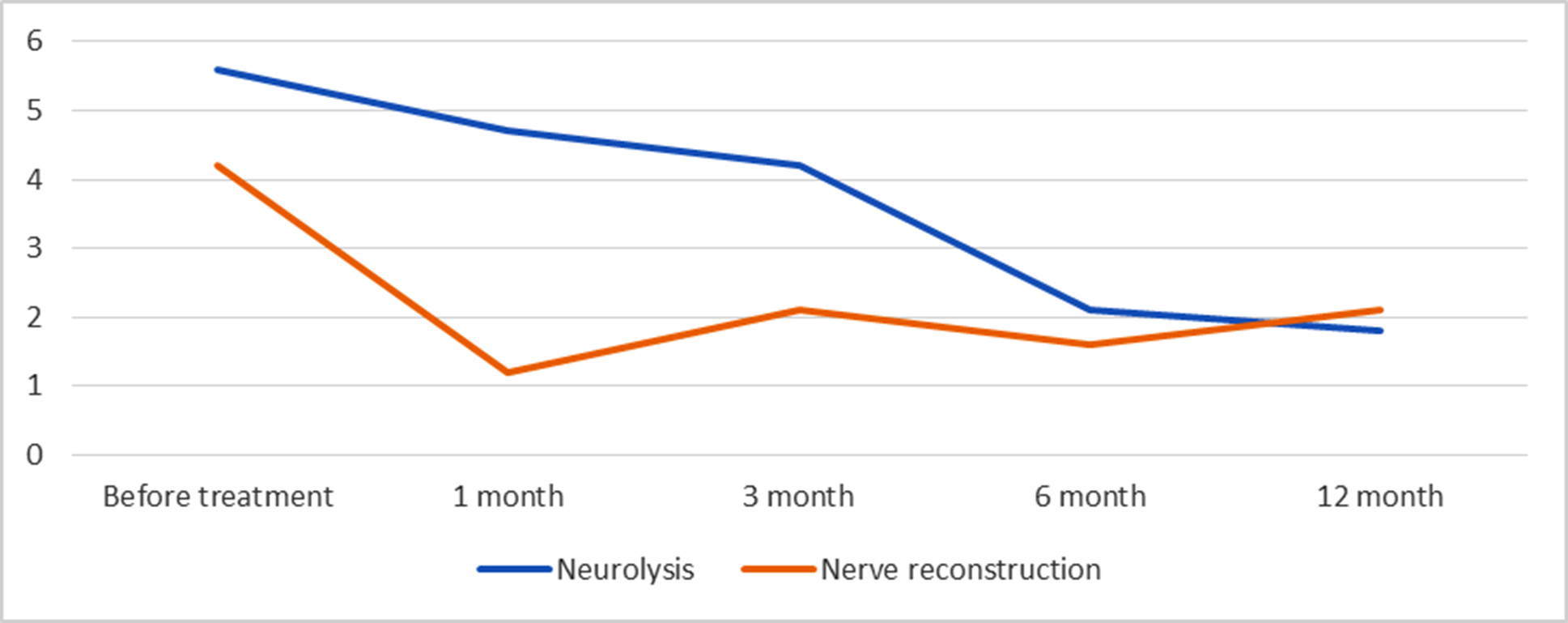 Conservative management provided satisfactory results in cases of mild pain syndrome, particularly when a positive clinical trend was observed during the first month of treatment (Fig. 6). Pharmacological therapy as a standalone modality should be considered the first-line treatment in patients with mild pain intensity (up to 3 cm on the VAS) and as baseline therapy in combination with hydrodissection, injection-based interventions, or during the early postoperative period. Hydrodissection in cases of fibrotic compression of a peripheral nerve significantly alleviated pain in the early postoperative period; however, pain intensity could increase over time, necessitating repeated procedures. Injection therapy demonstrated a good analgesic effect, although gradual exacerbation of pain was observed in some cases, potentially requiring repeated injections or subsequent surgical intervention.